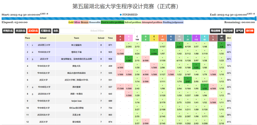 中国大学生程序设计竞赛湖北省赛于2023年4月30日在武汉大学举行。本次比赛由中国大学生程序设计竞赛湖北省组委会主办,武汉大学承办,华中科技大学协办,华为技术有限公司赞助。来自武汉大学、华中科技大学、北京理工大学、中南大学、西安交通大学等38所高校和多家企业的196支队伍参加了此次比赛,我校的“树上猫猫虫”队获得第一名。