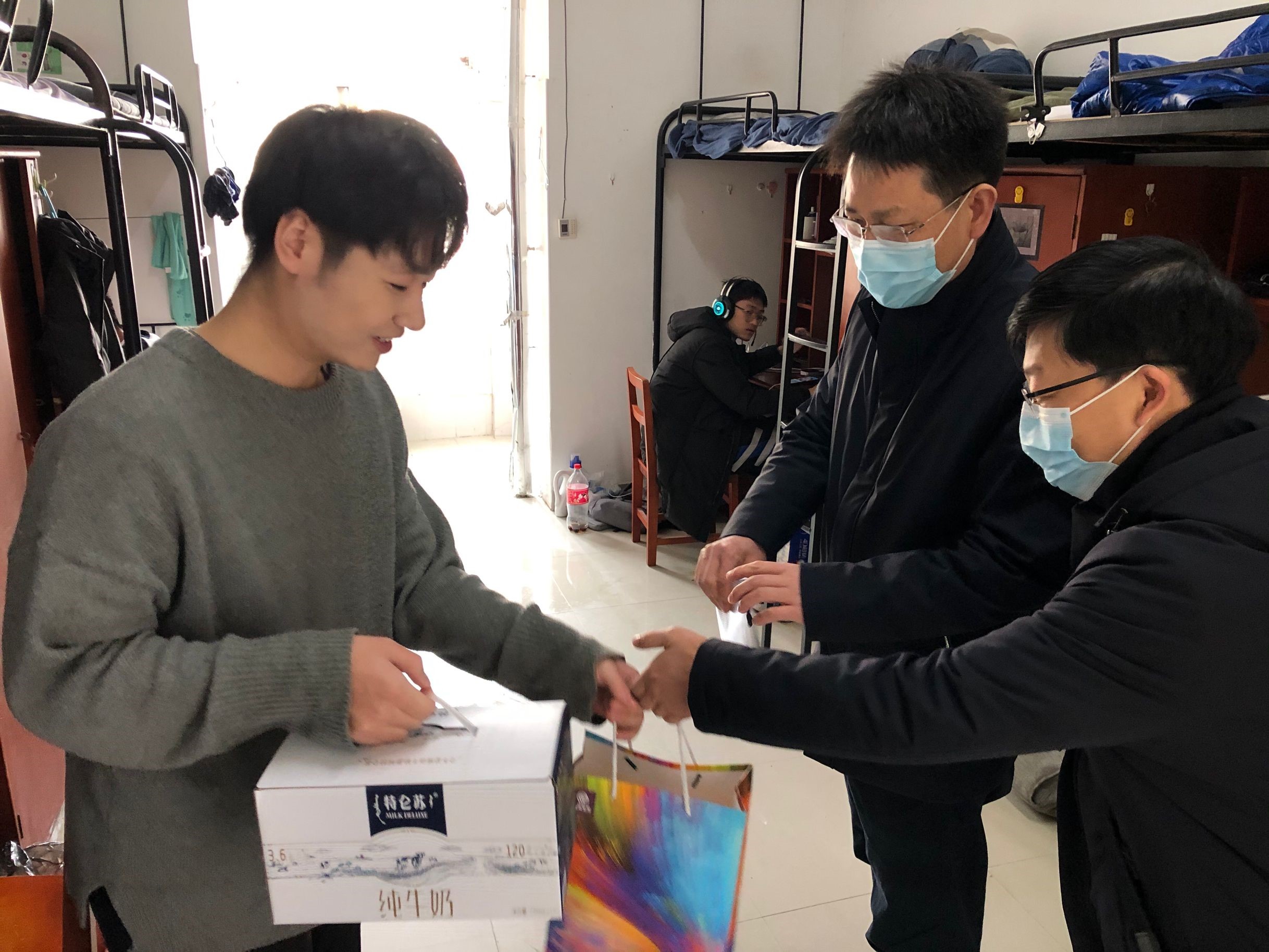心系学生发展,注重学生健康,给予学生冬日的温暖,2021年1月16日上午,计算机科学与技术色色视频 党委书记张晓寒、党委副书记徐小波、辅导员石林走访慰问色色视频因疫情滞留在校的学生,给学生送去生活用品和当下急需的口罩、消毒液等防疫物资。