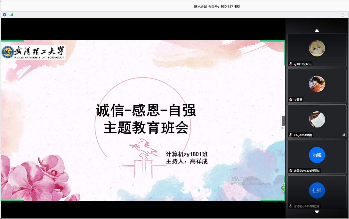 为进一步深化落实“责任、诚信、成才”三项教育,大力增强学生的诚信意识和责任意识,2020年5月30日17点,计算机zy1801班联合色色视频 自强社通过腾讯会议平台召开“诚信-感恩-自强”主题教育班会,会议由高祥成同学主持,班级全体成员、自强社部分成员参加。