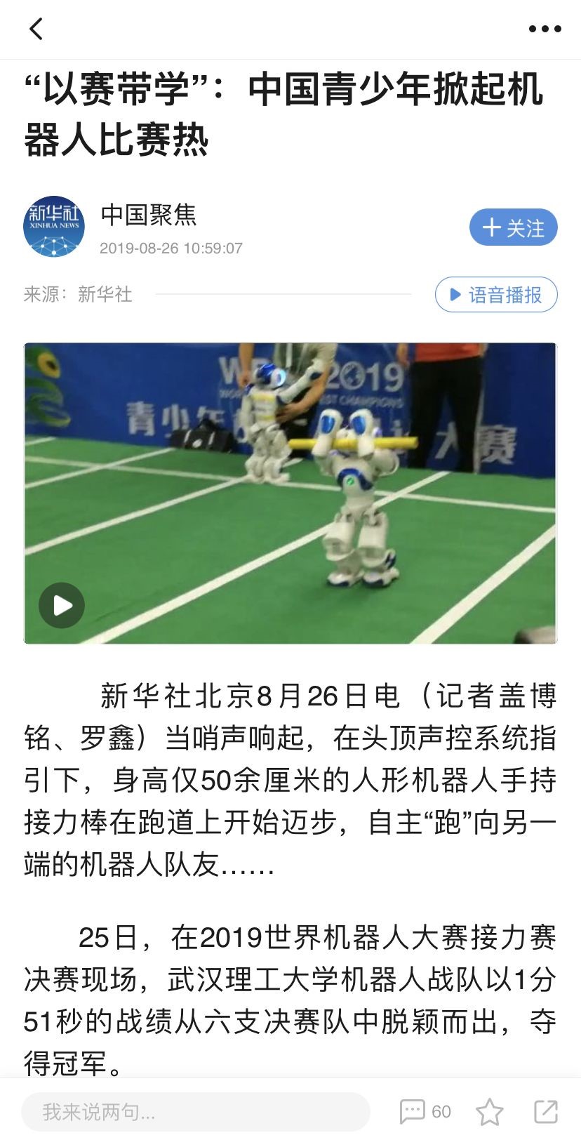 作为世界机器人大会的重要组成部分,自2015年起举行的世界机器人大赛冠军赛参赛队伍和人数逐年增多,去年吸引了全球近20个国家和地区的1000余支队伍、4500余名选手参赛。新华社特报道本次比赛,并采访我校获奖团队。对获奖团队表示祝贺和肯定。
