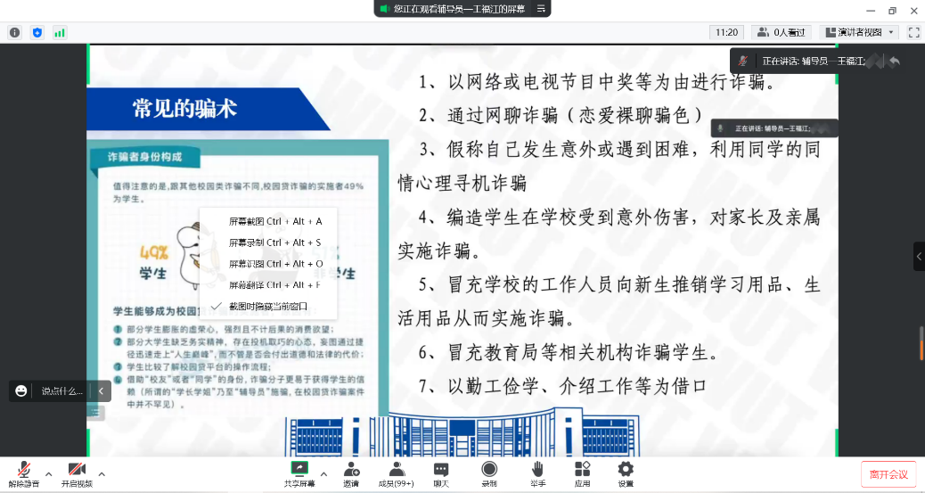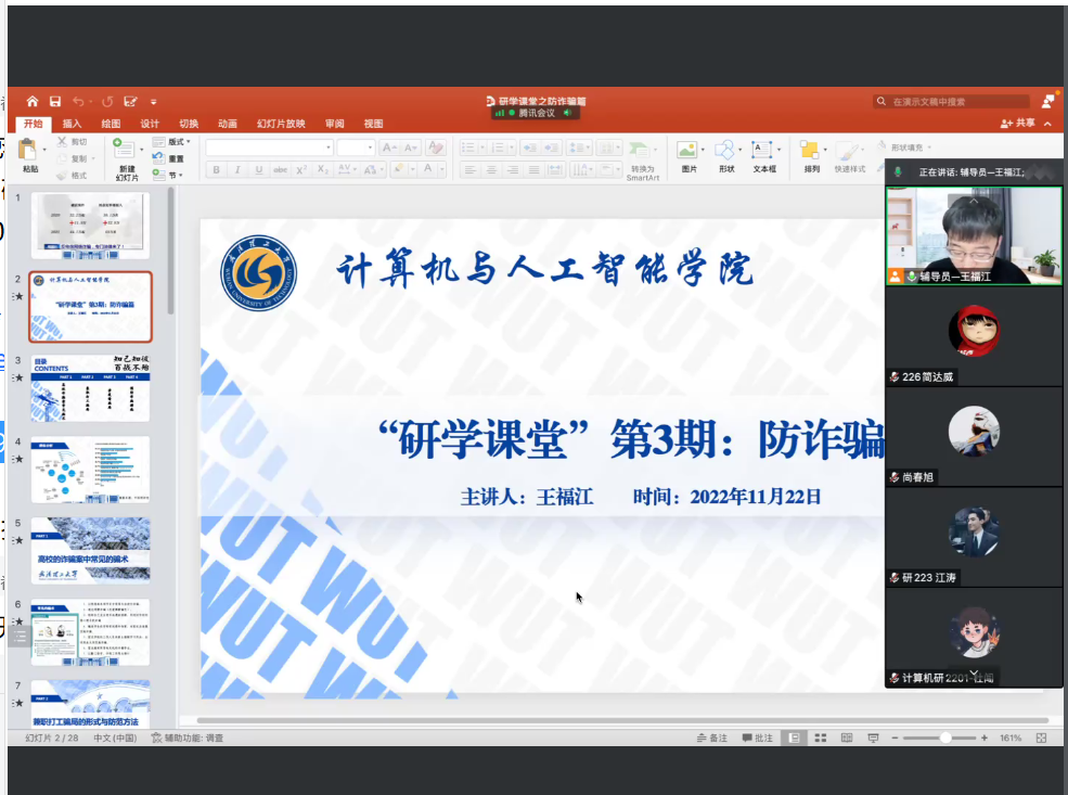 11月22日晚8:00,色色视频 “研学讲堂”第三期:防诈骗篇线上宣讲顺利开展,辅导员王福江老师带领2022级全体研究生共同学习,切实增强学生们反诈骗意识和识诈防骗的能力。
