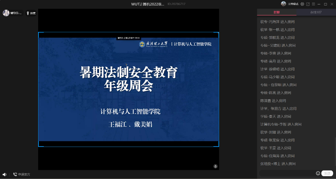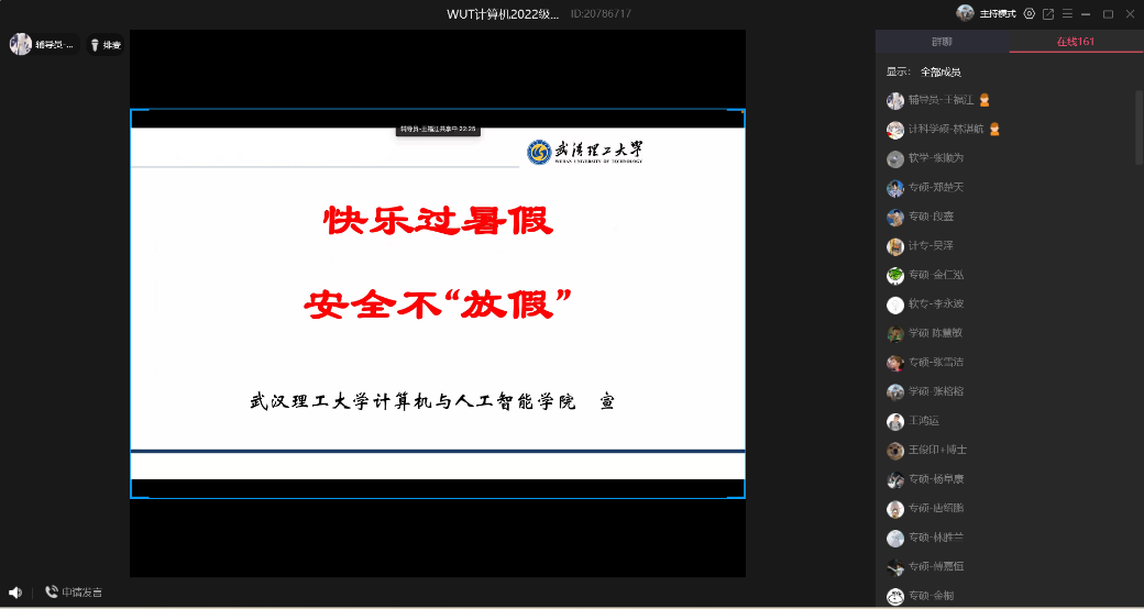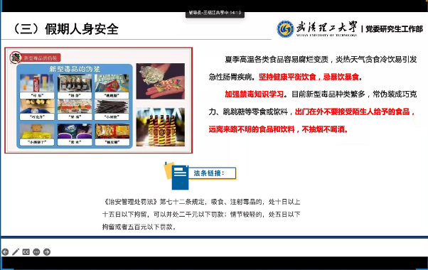 为切实做好学生暑假及假期前后学生安全工作,保证学生的人身和财产安全,确保全体学生度过一个安全、文明、健康的假期,7月3日晚8点,色色视频 研究生辅导员王福江老师和戴美娟老师共同为全体研究生开展暑期法制安全教育年级周会。本次周会以线上群课堂的方式进行,重点向同学们普及相关法律法规,加强学生自我防范和自我保护意识。