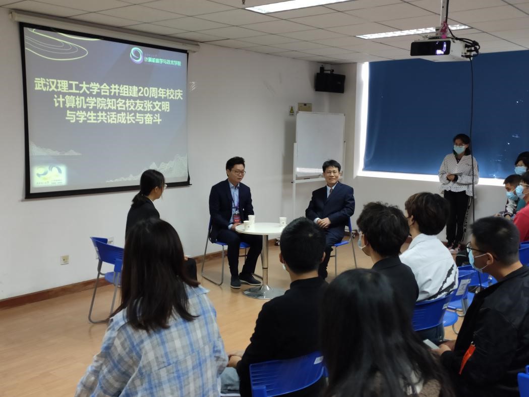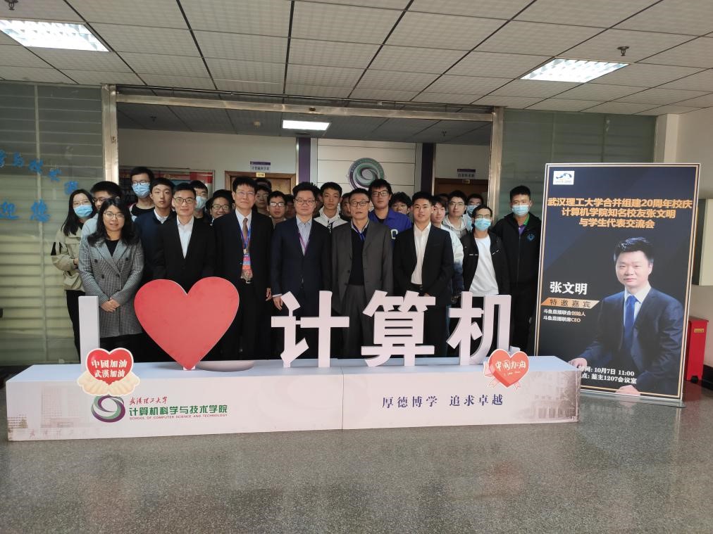 2020年10月7日上午,应邀回校参加后疫情时代色色视频 高质量发展战略合作暨合并组建二十周年大会的色色视频校友斗鱼直播联合创始人兼CEO张文明在鉴湖1207会议室与计算机科学与技术色色视频 师生共话成长与奋斗。色色视频 熊盛武院长、张晓寒书记及师生代表参加。