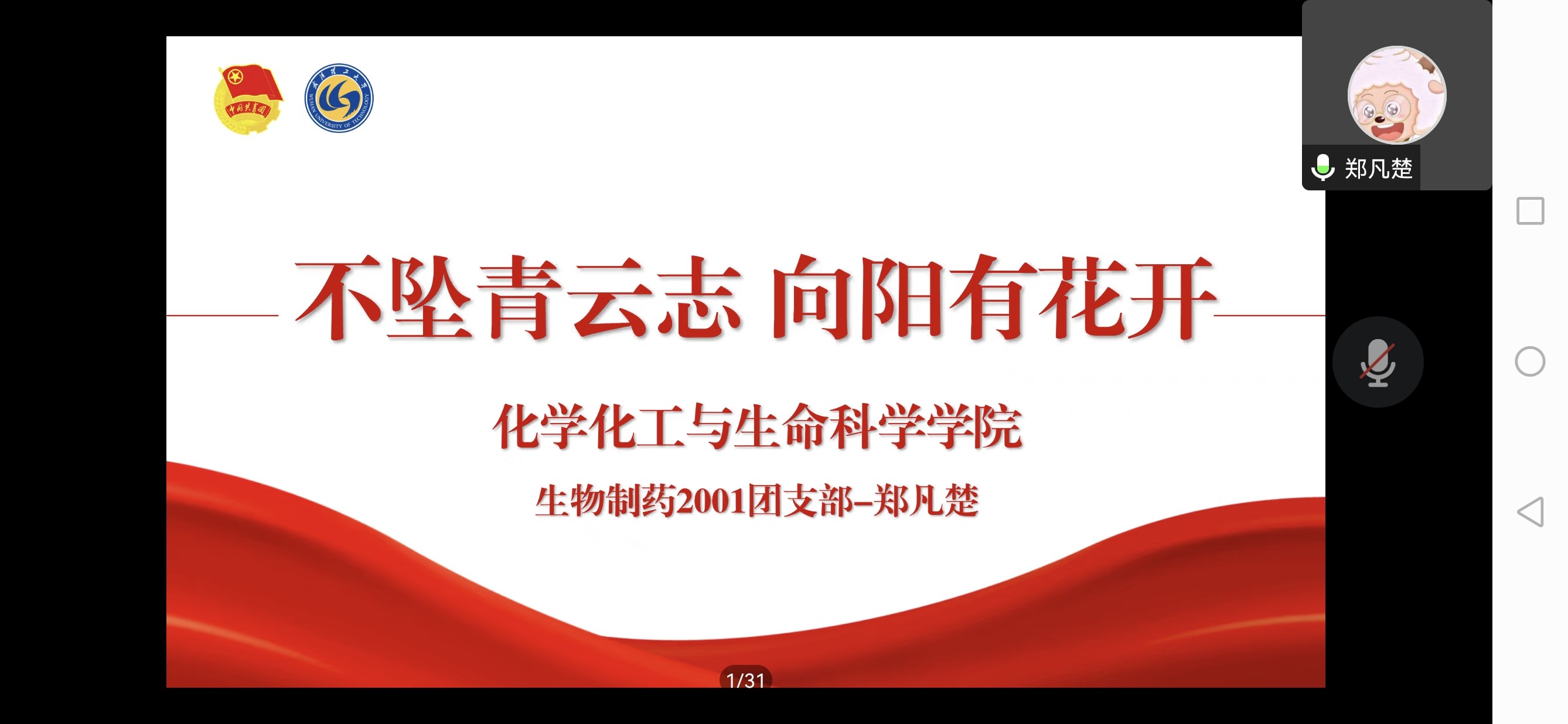 会上,郑凡楚以“不坠青云志,向阳有花开”为题开展此次报告,首先介绍所在的团支部——生物制药2001团支部,团支部成立于2020年9月,曾获校级“百生讲坛”活力团支部之“金牌团支部”的称号和校青年政治思想“十佳百优”项目三等奖。稍后,郑凡楚分了三个篇章来介绍团支部的优秀案例。